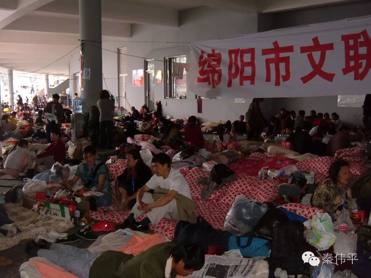 在机场我们加入了一群有组织的志愿者队伍,抵达成都后,直接转车去了绵阳体育馆,那里是灾区最大的受灾安置中心之一,需要大量志愿者做一些后勤辅助工作。抵达的时候已经是深夜,满目狼藉。